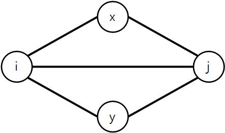 Figure 2. $p(i, j) = 3$인 경우의 예시 위는 $p(i, j) = 3$을 만족하게 만든 그래프이다. 중복 간선이 존재하지 않으므로, 위와 같이 $i$에서 $j$로 가는 동일한 단순 경로 위에 존재하지 않는 두 정점 $x$, $y$가 존재하게 된다.