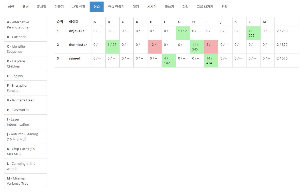 내가 H에서 10페널티, 성재가 I에서 13페널티를 쌓고 풀었는데, 나는 메모리 제한때문에, 성재는 시간에 걸려서(Big Integer을 사용해야 해서 파이썬을 사용했다.) 많은 페널티를 쌓았다. 온조가 L까지 풀고, 이후에는 세명 다 삽질만 하다가 끝났다.